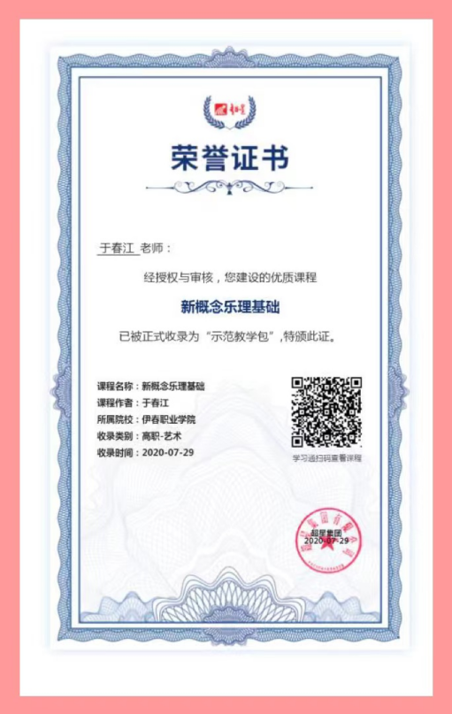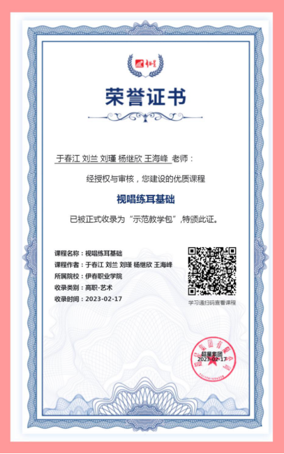 音樂(lè)教育教研室主任于春江老師帶領(lǐng)的音樂(lè)教育專業(yè)課程教學(xué)創(chuàng)新團(tuán)隊(duì)(于春江、劉蘭、劉瑾、楊繼欣、王海峰),于2023年2月完成網(wǎng)絡(luò)精品在線開放課程《視唱練耳基礎(chǔ)》的建設(shè),并被高職教學(xué)資源庫(kù)收錄。