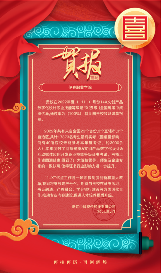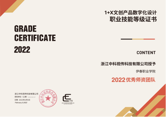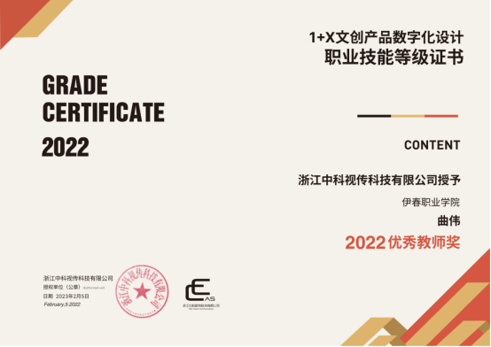 近日,浙江中科視傳科技有限公司針對2022年度“1+X”工作開展中的優(yōu)秀院校給予表彰,我校榮獲2022年度“1+X文創(chuàng)產(chǎn)品數(shù)字化設(shè)計職業(yè)技能等級證書”優(yōu)秀教學(xué)院校、帶頭模范院校及優(yōu)秀師資團隊等榮譽。