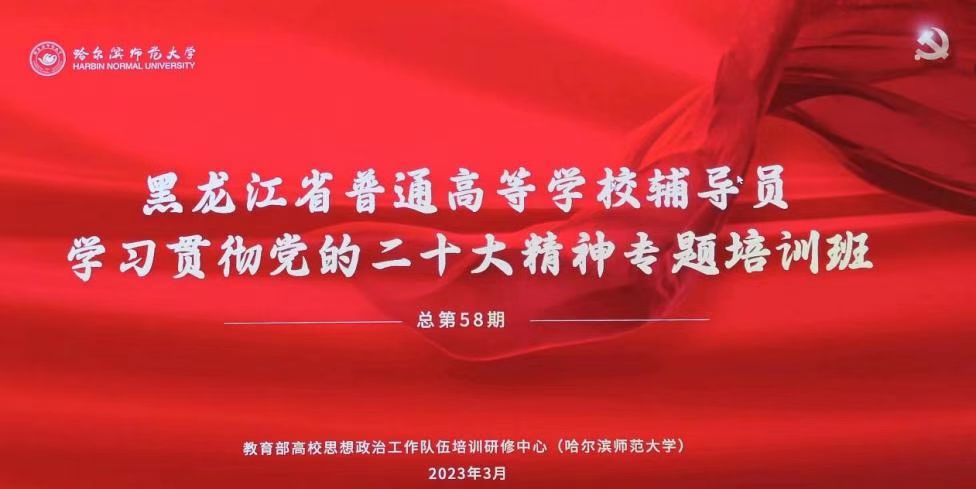 為全面落實習近平新時代中國特色社會主義思想,持續(xù)深化學習貫徹宣傳黨的二十大精神,進一步加強輔導(dǎo)員隊伍建設(shè),提升高校思想政治工作質(zhì)量,把輔導(dǎo)員的思想和行動統(tǒng)一到黨的二十大精神上來,3月23日-3月31日,我校共組織32名專職輔導(dǎo)員參加“黑龍江省普通高等學校輔導(dǎo)員學習貫徹黨的二十大精神專題培訓(xùn)班”。