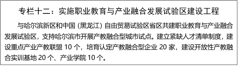 2.提升服務(wù)重大戰(zhàn)略能力。省教育廳等有關(guān)單位與哈爾濱新區(qū)和中國(黑龍江)自由貿(mào)易試驗(yàn)區(qū)共建職業(yè)教育與產(chǎn)業(yè)融合發(fā)展試驗(yàn)區(qū),探索政府、園區(qū)、行企、院所多方協(xié)同發(fā)展模式,建立區(qū)域性產(chǎn)教融合激勵機(jī)制,建設(shè)一批高水平產(chǎn)教融合平臺,形成可復(fù)制經(jīng)驗(yàn)做法,為全省職業(yè)教育深化產(chǎn)教融合提供借鑒。與北大荒農(nóng)墾集團(tuán)、龍江森工集團(tuán)政企合作共建企辦職業(yè)學(xué)校試驗(yàn)區(qū),探索政府支持企業(yè)舉辦職業(yè)教育的政策體系,完善企業(yè)管理下的現(xiàn)代職業(yè)學(xué)校治理體系,探索國有企業(yè)辦好高質(zhì)量職業(yè)教育的范式,提升服務(wù)“三大一航母”和“綠色生態(tài)屏障”建設(shè)能力,為現(xiàn)代農(nóng)業(yè)和生態(tài)產(chǎn)業(yè)提供支撐。與“四煤城”共建職業(yè)教育轉(zhuǎn)型發(fā)展試驗(yàn)區(qū),探索資源枯竭型城市職業(yè)教育轉(zhuǎn)換服務(wù)面向,服務(wù)接續(xù)產(chǎn)業(yè)和民生的發(fā)展路徑,提升服務(wù)城市產(chǎn)業(yè)升級替代能力。支持高等職業(yè)學(xué)校與邊境縣(市、區(qū))共建職業(yè)教育辦學(xué)聯(lián)盟,為實(shí)施興邊富民行動提供支撐。