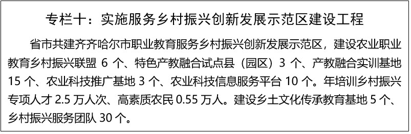 4.建設(shè)鄉(xiāng)村振興創(chuàng)新發(fā)展示范區(qū)。省市共建齊齊哈爾市職業(yè)教育服務(wù)鄉(xiāng)村振興創(chuàng)新發(fā)展示范區(qū)。成立農(nóng)業(yè)職業(yè)教育鄉(xiāng)村振興聯(lián)盟,建立院縣共建合作機(jī)制。對接齊齊哈爾市鄉(xiāng)村振興產(chǎn)業(yè)體系發(fā)展和人才技術(shù)服務(wù)等重大需求,實(shí)施鄉(xiāng)村振興產(chǎn)教融合建設(shè)工程、技能人才培養(yǎng)培訓(xùn)工程、農(nóng)業(yè)科技服務(wù)工程、鄉(xiāng)村治理能力提升工程、農(nóng)村職業(yè)教育基礎(chǔ)能力提升工程,建設(shè)一批鄉(xiāng)村振興人才培養(yǎng)優(yōu)質(zhì)校、鄉(xiāng)村振興產(chǎn)業(yè)學(xué)院,探索職業(yè)教育服務(wù)鄉(xiāng)村振興實(shí)踐路徑和服務(wù)范式,帶動全省職業(yè)教育與鄉(xiāng)村振興同頻互動,為全省乃至全國提供可借鑒可推廣的經(jīng)驗(yàn)和模式。