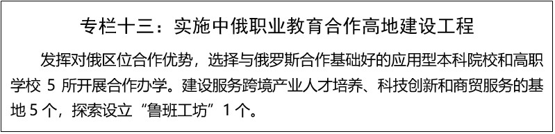 2.打造中俄職業(yè)教育合作高地。推動建立中俄職業(yè)教育合作交流平臺,實(shí)施優(yōu)秀教師、專家和學(xué)生交流計(jì)劃,推動中俄優(yōu)秀教師、專家和學(xué)生雙向互訪研修。探索舉辦中俄等國家參與的職業(yè)技能比賽。面向中國(黑龍江)自由貿(mào)易試驗(yàn)區(qū)新材料、高端裝備、能源、商貿(mào)物流、旅游等產(chǎn)業(yè)需求,打造一批服務(wù)中俄跨境產(chǎn)業(yè)人才培養(yǎng)、科技創(chuàng)新和商貿(mào)服務(wù)的基地。支持有條件的職業(yè)學(xué)校在俄羅斯設(shè)立“魯班工坊”。