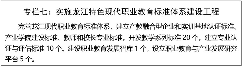 1.建立龍江特色職業(yè)教育標(biāo)準(zhǔn)。建立現(xiàn)代職業(yè)教育標(biāo)準(zhǔn)體系,制定產(chǎn)教融合型企業(yè)和實(shí)訓(xùn)基地認(rèn)證標(biāo)準(zhǔn)、產(chǎn)業(yè)學(xué)院建設(shè)標(biāo)準(zhǔn)。制定并實(shí)施教師和校長專業(yè)標(biāo)準(zhǔn),提升職業(yè)學(xué)校教學(xué)管理和教學(xué)實(shí)踐能力。在現(xiàn)代農(nóng)業(yè)、裝備制造、生物醫(yī)藥、冰雪旅游、健康養(yǎng)老等優(yōu)勢領(lǐng)域,建設(shè)一批高于國家標(biāo)準(zhǔn)的具有龍江特色的專業(yè)、教學(xué)、課程、實(shí)習(xí)、實(shí)訓(xùn)條件的標(biāo)準(zhǔn)體系,推動學(xué)校體系、標(biāo)準(zhǔn)體系、培養(yǎng)體系、育人機(jī)制、評價體系一體化。建立不同類型學(xué)習(xí)成果認(rèn)定與轉(zhuǎn)換標(biāo)準(zhǔn)。加強(qiáng)職業(yè)教育發(fā)展智庫建設(shè),支持有條件的學(xué)校成立職業(yè)教育與產(chǎn)業(yè)發(fā)展研究平臺,設(shè)立一批省級重點(diǎn)研究項(xiàng)目,產(chǎn)生一批高水平研究成果。