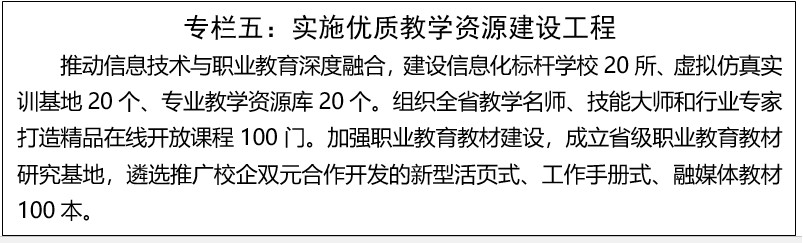3.加強(qiáng)教學(xué)信息化建設(shè)。建設(shè)省級“智慧職教”服務(wù)管理平臺,運(yùn)用云平臺、人工智能和大數(shù)據(jù)技術(shù),為職業(yè)教育提供信息化教學(xué)資源、數(shù)據(jù)分析預(yù)測、教學(xué)質(zhì)量監(jiān)控等服務(wù)。推進(jìn)職業(yè)學(xué)校數(shù)字校園建設(shè),培育一批信息化標(biāo)桿學(xué)校。開發(fā)一批虛擬仿真實(shí)訓(xùn)基地、專業(yè)教學(xué)資源庫和精品在線開放課程。組織開展職業(yè)學(xué)校教師信息化培訓(xùn),提高線上線下混合式教學(xué)質(zhì)量。