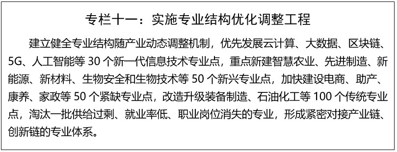 2.鞏固專科高等職業(yè)教育的主體地位。實(shí)施好“雙高”建設(shè)計(jì)劃,培育建設(shè)一批高水平高等職業(yè)學(xué)校和專業(yè)(群)。以涉農(nóng)學(xué)校為突破口,推進(jìn)高等職業(yè)學(xué)校資源整合。將符合條件的技師學(xué)院納入高等學(xué)校序列。成立由高水平本科、高職、中等職業(yè)學(xué)校組成的G40聯(lián)盟,建立“中高本”一體化協(xié)同發(fā)展機(jī)制。對接我省現(xiàn)代農(nóng)業(yè)、農(nóng)副產(chǎn)品精深加工、裝備制造、醫(yī)藥化工、冰雪旅游等重點(diǎn)產(chǎn)業(yè),重點(diǎn)建設(shè)一批高水平專業(yè)(群)。對接黑土地保護(hù)、數(shù)字經(jīng)濟(jì)、人工智能、智能制造等戰(zhàn)略新興產(chǎn)業(yè),重點(diǎn)建設(shè)一批交叉融合新興專業(yè)(群)。