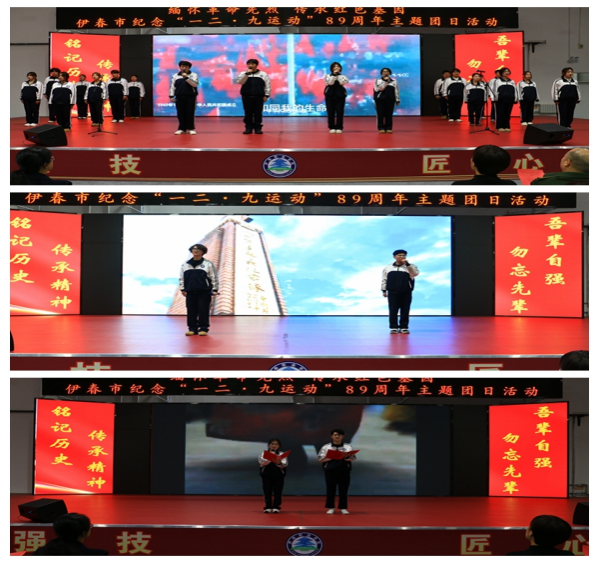 活動在大合唱《祖國不會忘記》中拉開帷幕,深情的旋律中包含著對黨的深厚感情。在詩朗誦《我心中的“一二·九”》《毛澤東詩詞組歌》《林業(yè)三師在伊春、馬永順精神永流傳》等節(jié)目中,青年學(xué)生們的聲音或抑揚(yáng)頓挫,或鏗鏘有力,或輕柔舒緩地朗讀,充分表達(dá)了青年們銘記歷史、熱愛祖國的情懷和報(bào)效祖國、服務(wù)人民的決心。合唱《送別·長亭外》《我愛你中國》《國家》每一個(gè)音符都跳躍著青春的旋律,每一句歌詞都飽含著對祖國的深情厚誼,唱出了對祖國母親的真摯情感和深情贊頌。讀書分享《小城三月》訴說了舊時(shí)代傳統(tǒng)女性受新文化影響后覺醒反抗的過程,讓我們感受到了民族的覺醒與時(shí)代的脈搏。歌曲《歌唱祖國》更是將現(xiàn)場氣氛推向了高潮,讓同學(xué)們在嘹亮的歌聲中感受祖國的繁榮昌盛和中華兒女的驕傲與自豪。