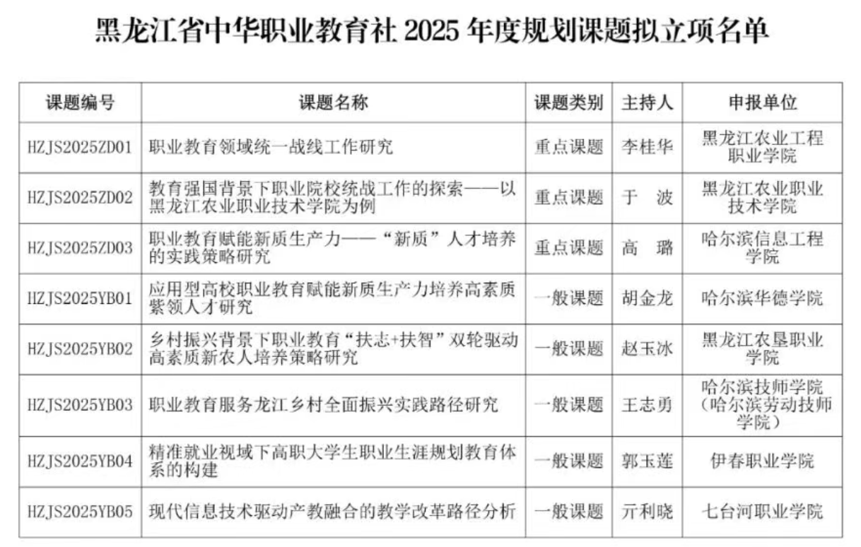 近日,黑龍江省中華職業(yè)教育社發(fā)布課題立項(xiàng)名單。省職教社經(jīng)資格審查、專(zhuān)家評(píng)審等環(huán)節(jié),我校郭玉蓮負(fù)責(zé)的課題《精準(zhǔn)就業(yè)視域下高職大學(xué)生職業(yè)生涯規(guī)劃教育體系的構(gòu)建》獲得黑龍江省中華職業(yè)教育社一般課題立項(xiàng)。課題組將利用現(xiàn)有條件進(jìn)行精準(zhǔn)化教育體系設(shè)計(jì)、動(dòng)態(tài)需求匹配、數(shù)據(jù)驅(qū)動(dòng)決策、產(chǎn)教融合等理論與實(shí)踐探索。