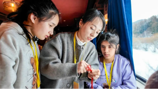 列車上,一場制作中國結(jié)的活動(dòng)格外引人注目。孩子們圍坐在一起,認(rèn)真聆聽工作人員講解編織方法,五彩絲線在他們手中穿梭。